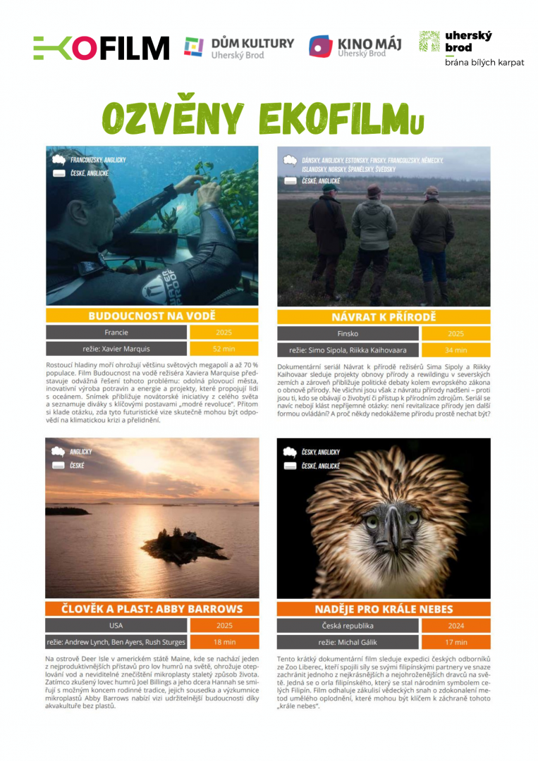 V malém sále Domu kultury mohou žáci a studenti škol v dopoledních hodinách (9:00–9:50 a 10:15–11:05) shlédnout projekci filmů zaměřených na ekologii a ochranu přírody v rámci akce OZVĚNY EKOFILMu. Pro širokou veřejnost bude projekce ZDARMA v odpoledních hodinách od 15:00 do 17:00.