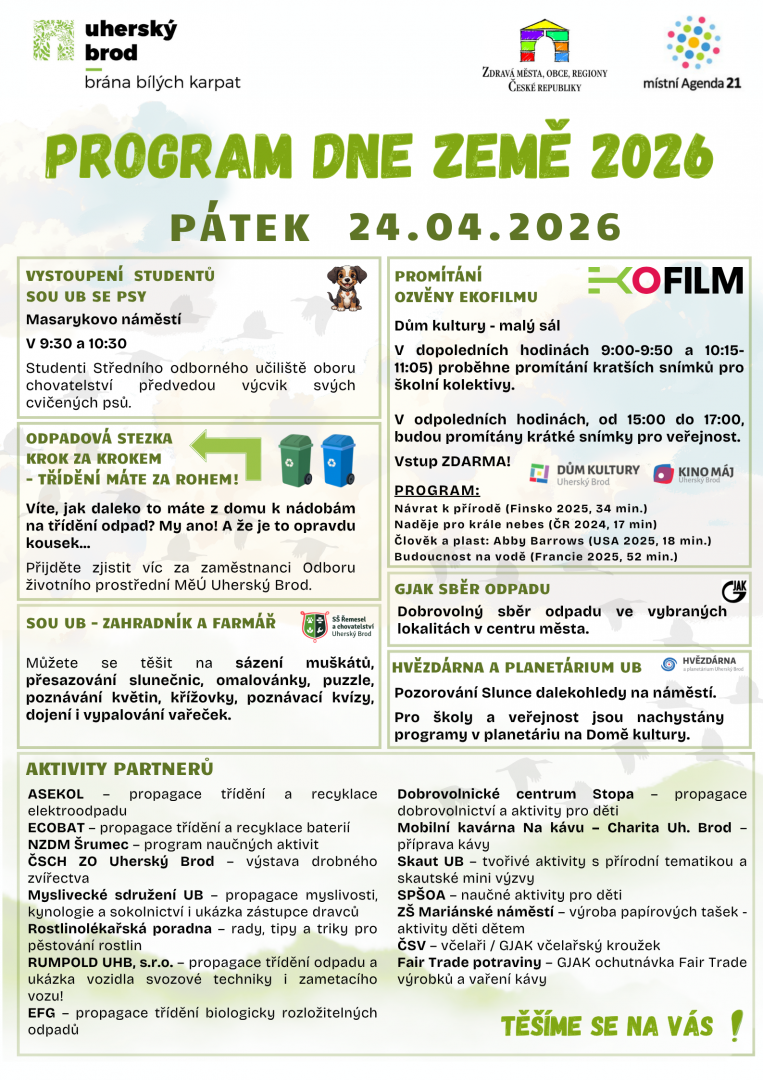 Srdečně Vás zveme na Den Země 2026, který se uskuteční v pátek 24. dubna na Masarykově náměstí v Uherském Brodě.