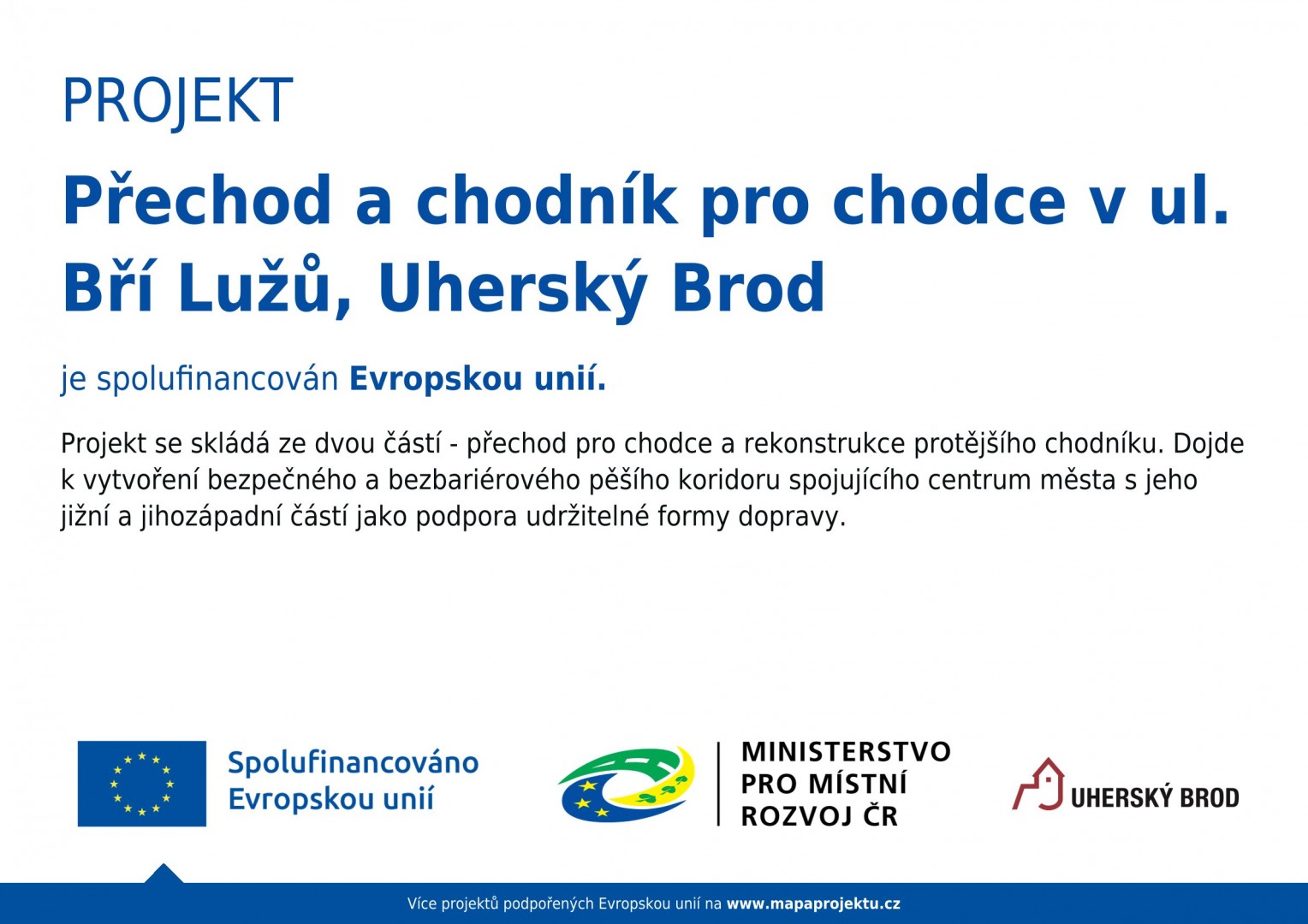 Projekt řešil opravu přechodu pro chodce včetně navazujících chodníků pro pěší na ulici Bří Lužů v Uherském Brodě. Upravena byla také místní komunikace a parkovací pruh. Chodník je upraven tak, aby dovedl chodce k opravenému přechodu pro chodce, který po úpravě splňuje normové hodnoty. V trase opravovaného chodníku na ulici Bří Lužů je navržena oprava přechodu pro chodce. Přechod je v šikmém provedení a splňuje normové hodnoty a rozhledové poměry. Opravovaný přechod má šířku 3,0 m, délku 5,0 m a je opatřen vodorovným dopravním značením.